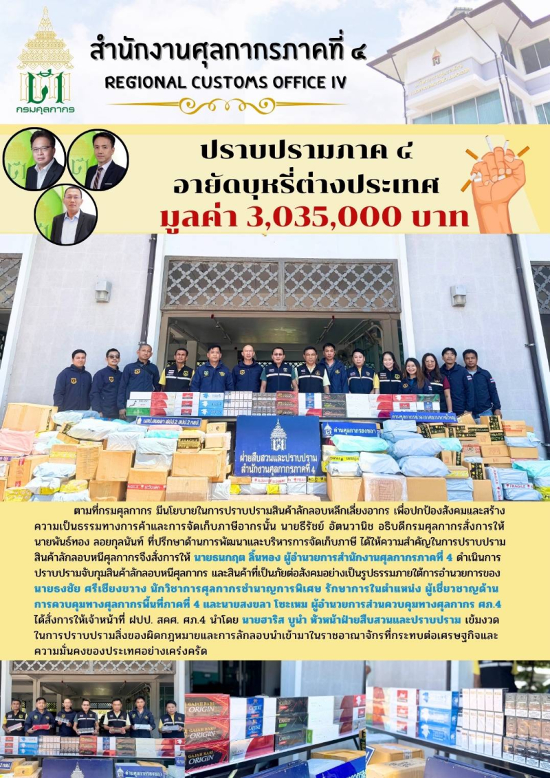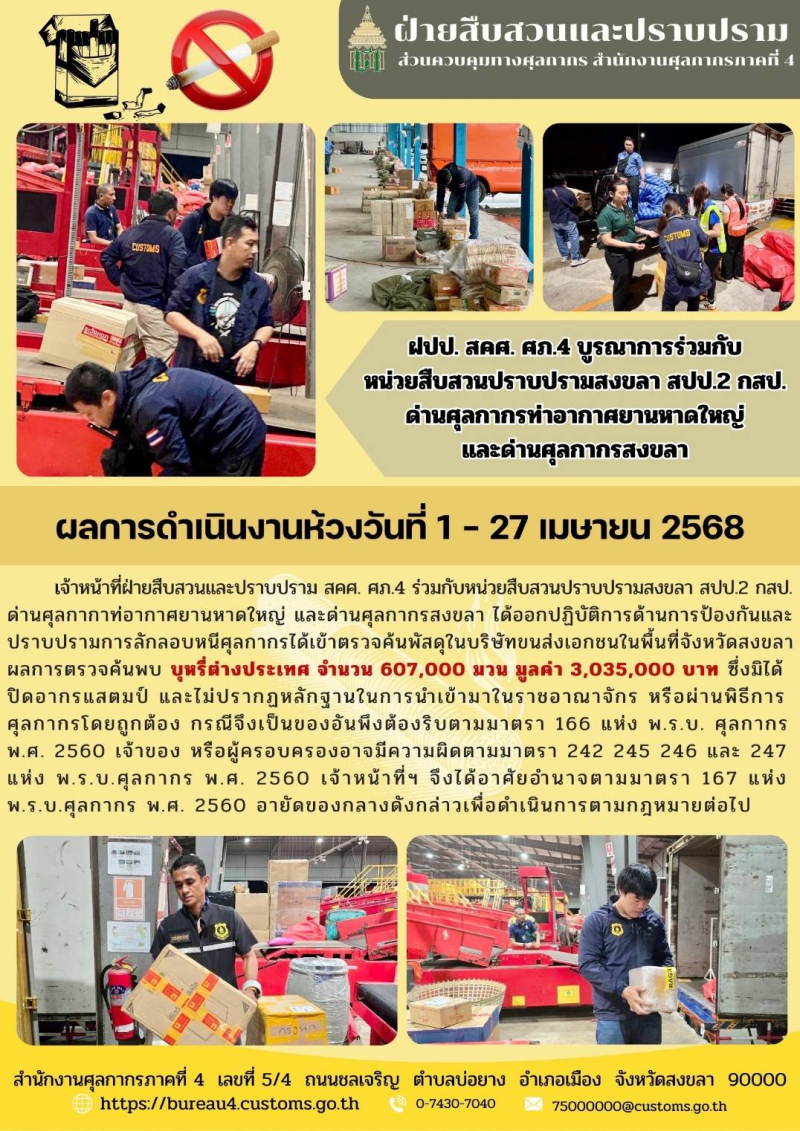 **ห้วงวันที่ 1-27 เม.ย.68 ฝปป.สคศ.ศภ.4 ร่วมกับหน่วยสืบสวนปราบปรามสงขลา สปป.2 กสป. ด่านฯสงขลา และ ด่านฯท่าอากาศยานหาดใหญ่ อายัดบุหรี่ต่างประเทศ มูลค่ากว่า 3 ล้านบาท**