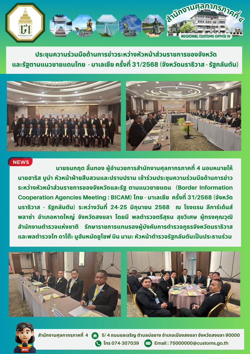 ผู้แทนสำนักงานศุลกากรภาคที่ 4 เข้าร่วมประชุมความร่วมมือด้านการข่าวระหว่างหัวหน้าส่วนราชการของจังหวัดและรัฐตามแนวชายแดนไทย - มาเลเซีย ครั้งที่ 31/2568 (จังหวัดนราธิวาส - รัฐกลันตัน)