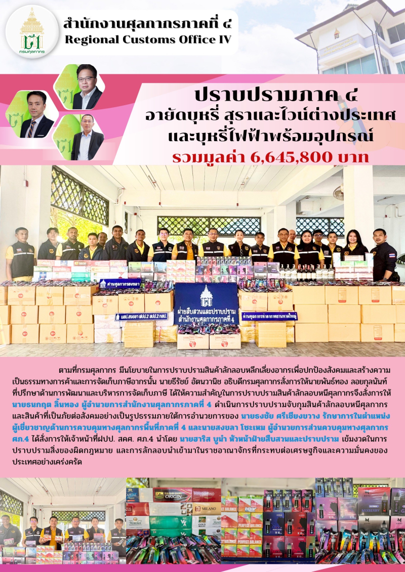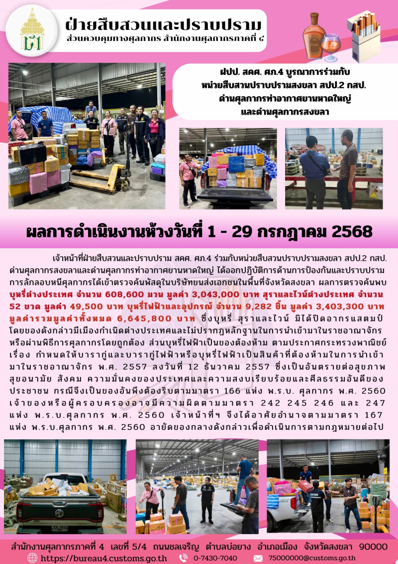 *** ฝปป. สคศ. ศภ.4 ร่วมกับหน่วยสืบสวนปราบปรามสงขลา สปป.2 กสป. ด่านศุลกากรท่าอากาศยานหาดใหญ่ และด่านศุลกากรสงขลา อายัดบุหรี่ สุรา ไวน์ต่างประเทศ และบุหรี่ไฟฟ้าพร้อมอุปกรณ์ รวมมูลค่ากว่า 6 ล้านบาท ***