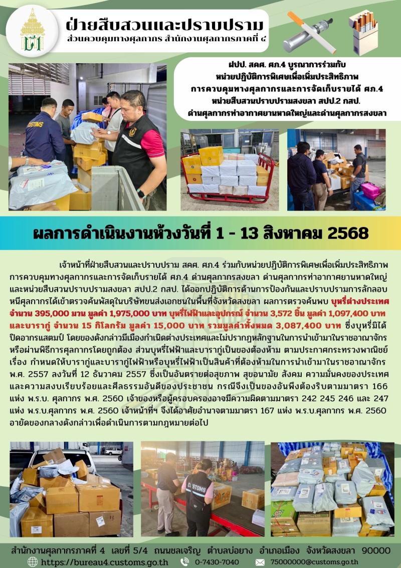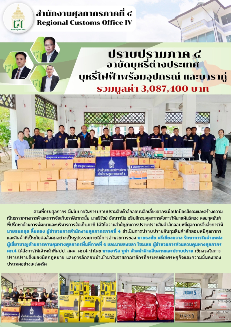 **ฝปป. สคศ. ศภ.4 ร่วมกับหน่วยปฏิบัติการพิเศษฯ ศภ.4 หน่วยสืบสวนปราบปรามสงขลา สปป.2 กสป. ด่านฯ หาดใหญ่ และด่านฯ สงขลา อายัดบุหรี่ต่างประเทศ บุหรี่ไฟฟ้าพร้อมอุปกรณ์และบารากู่ รวมมูลค่ากว่า 3ล้านบาท**