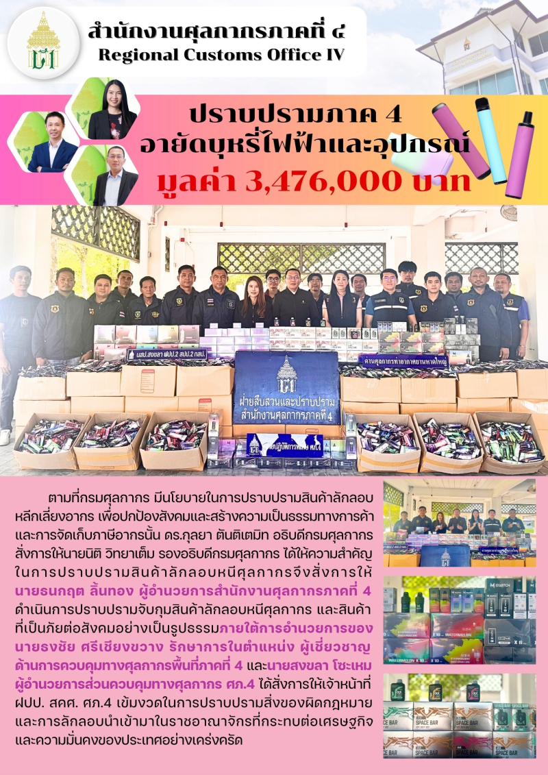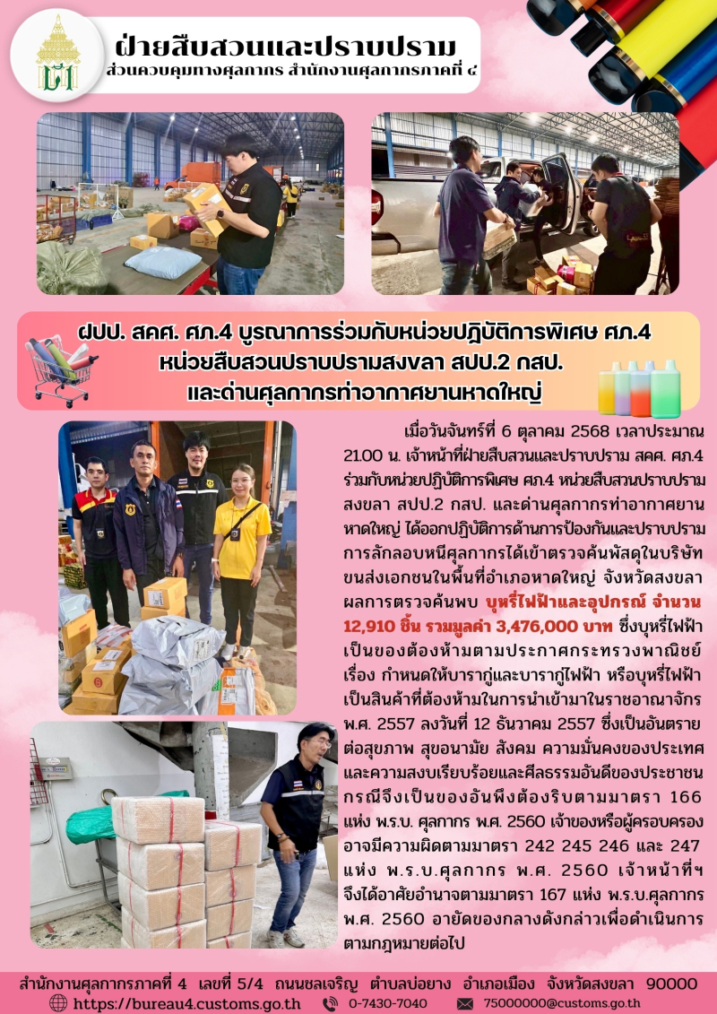 *** ฝปป.สคศ.ศภ.4 ร่วมกับหน่วยปฏิบัติการพิเศษ ศภ.4 หน่วยสืบสวนปราบปรามสงขลา สปป.2 กสป. และด่านศุลกากรท่าอากาศยานหาดใหญ่ อายัดบุหรี่ไฟฟ้าพร้อมอุปกรณ์ รวมมูลค่ากว่า 3 ล้านบาท ***