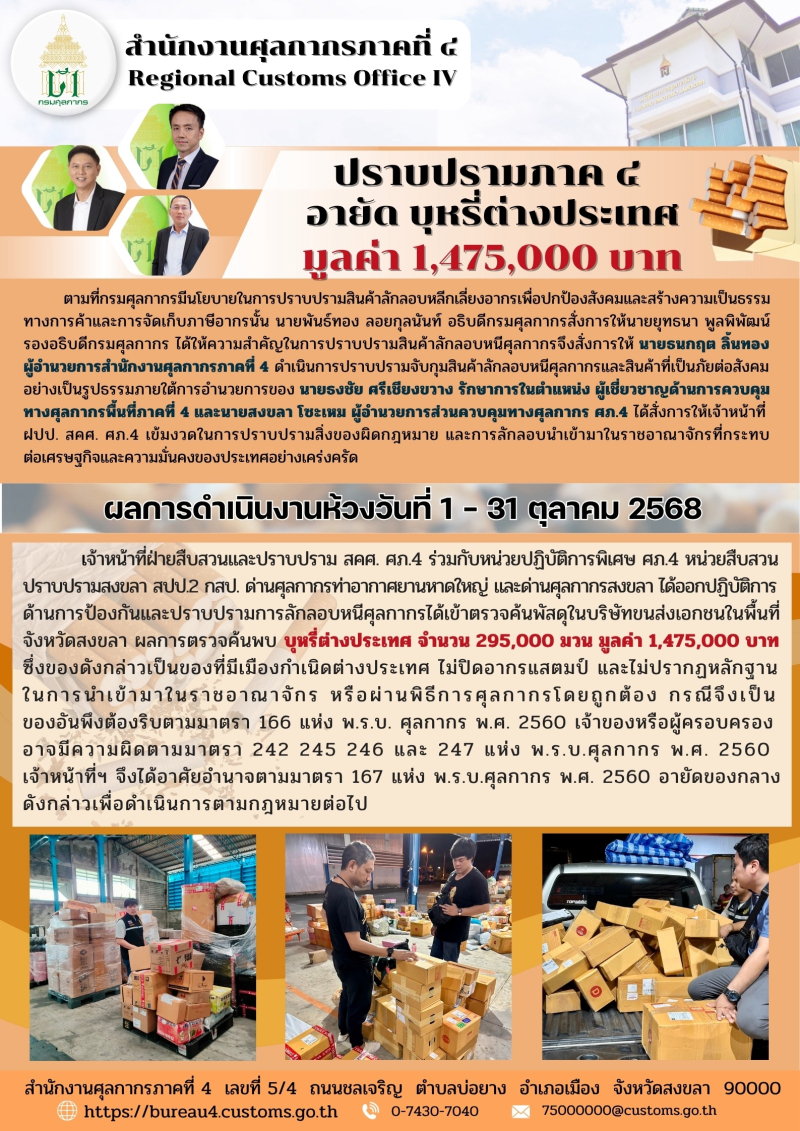 *** ฝปป.สคศ.ศภ.4 ร่วมกับหน่วยปฏิบัติการพิเศษ ศภ.4 หน่วยสืบสวนปราบปรามสงขลา สปป.2 กสป. ด่านศุลกากรท่าอากาศยานหาดใหญ่ และด่านศุลกากรสงขลา อายัดบุหรี่ต่างประเทศ รวมมูลค่า 1,475,000 บาท ***