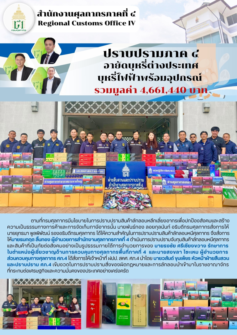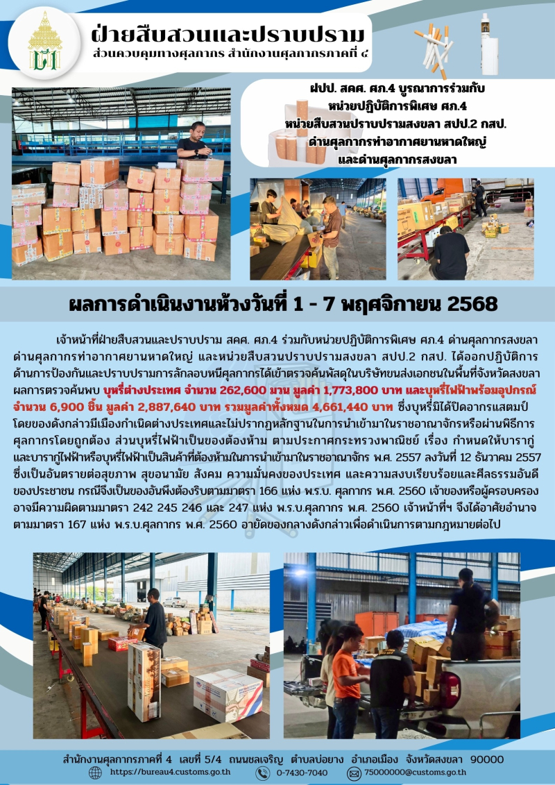 *** ฝปป.สคศ.ศภ.4 ร่วมกับหน่วยปฏิบัติการพิเศษ ศภ.4 หน่วยสืบสวนปราบปรามสงขลา สปป.2 กสป. ด่านศุลกากรท่าอากาศยานหาดใหญ่ และด่านศุลกากรสงขลา อายัดบุหรี่ต่างประเทศและบุหรี่ไฟฟ้าพร้อมอุปกรณ์ รวมมูลค่า 4,661,440 บาท ***