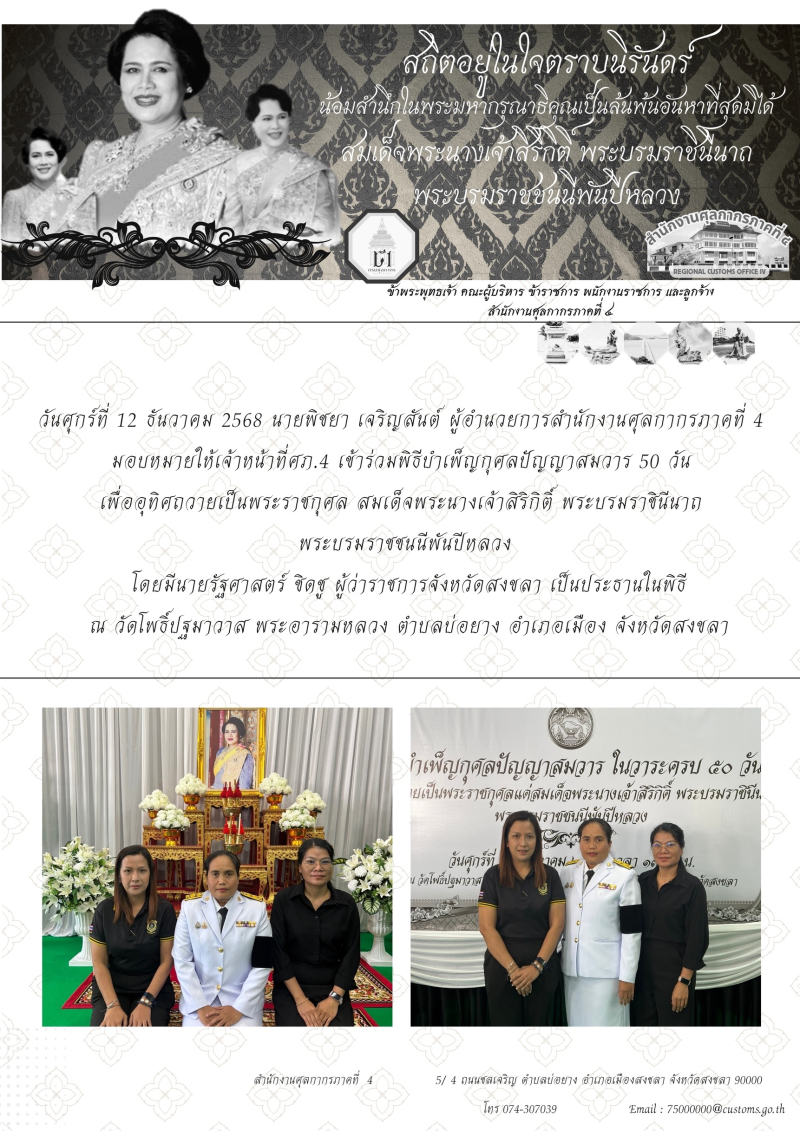 เจ้าหน้าที่ ศภ.4 เข้าร่วมพิธีบำเพ็ญกุศลปัญญาสมวาร (ครบ ๕๐ วัน) ถวายเป็นพระราชกุศลแด่สมเด็จพระนางเจ้าสิริกิติ์ พระบรมราชินีนาถฯ