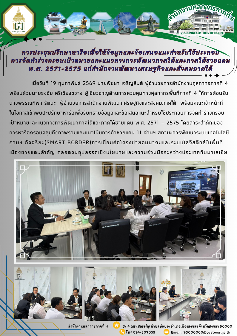 ++ ศภ.๔ ประชุมหารือเพื่อให้ข้อมูลและข้อเสนอแนะแก่สำนักงานพัฒนาเศรษฐกิจและสังคมภาคใต้ ++