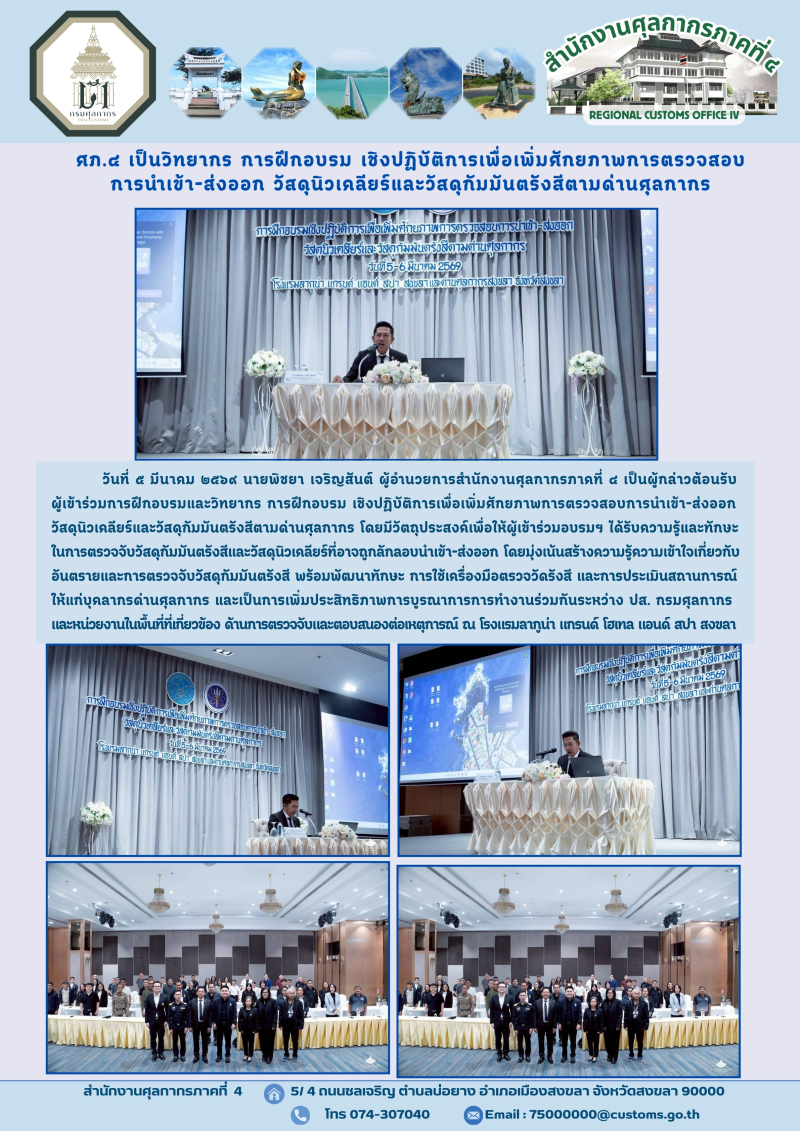 ++ศภ.๔ เป็นวิทยากร การฝึกอบรม เชิงปฏิบัติการเพื่อเพิ่มศักยภาพการตรวจสอบการนำเข้า-ส่งออก วัสดุนิวเคลียร์และวัสดุกัมมันตรังสีตามด่านศุลกากร++